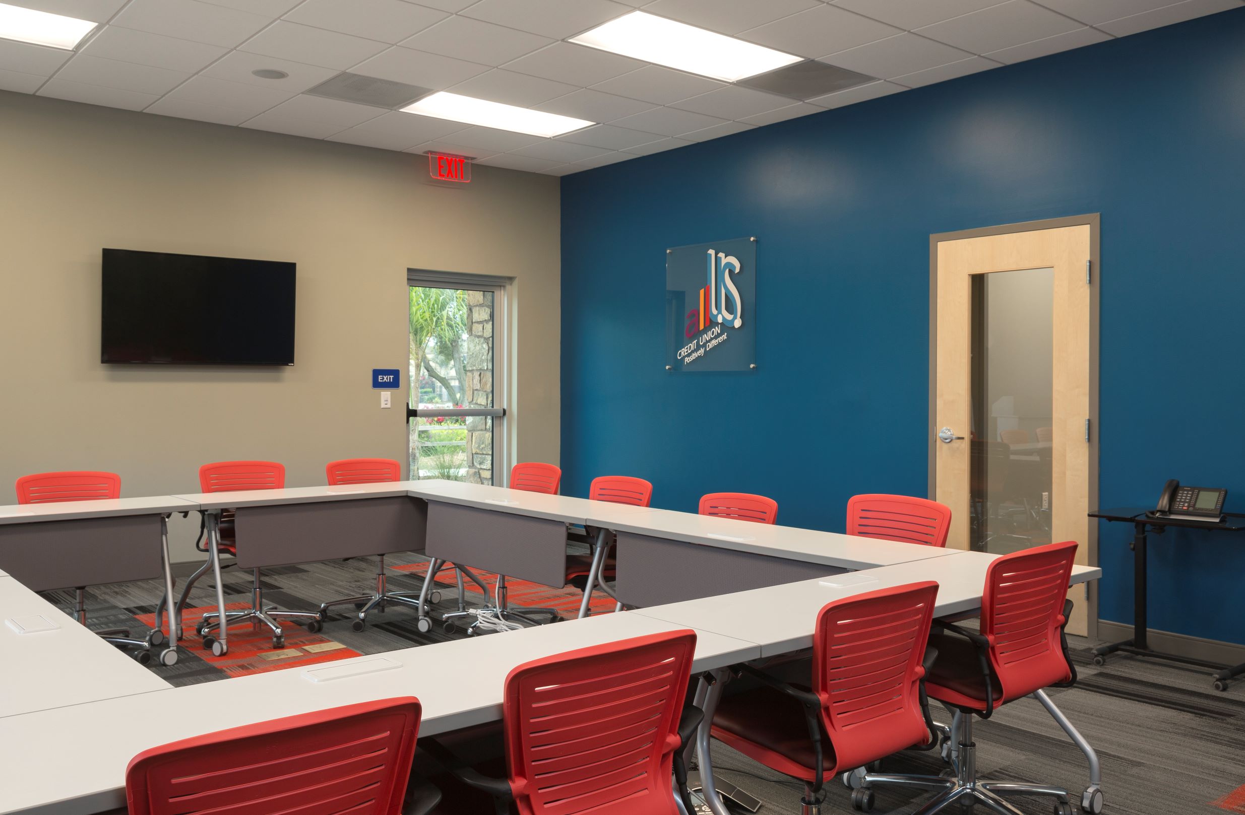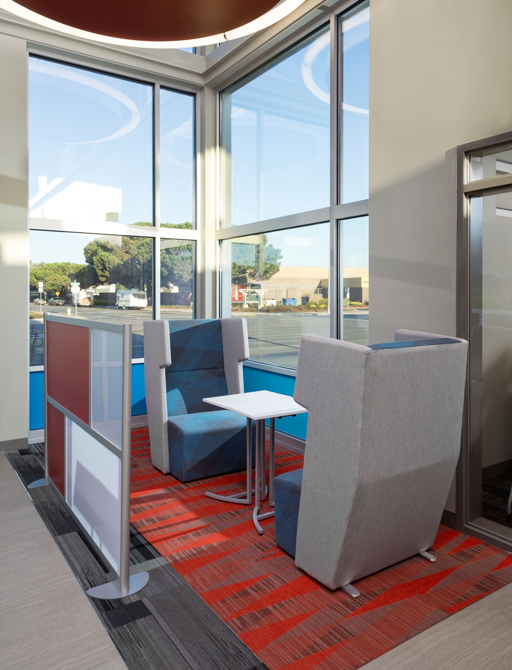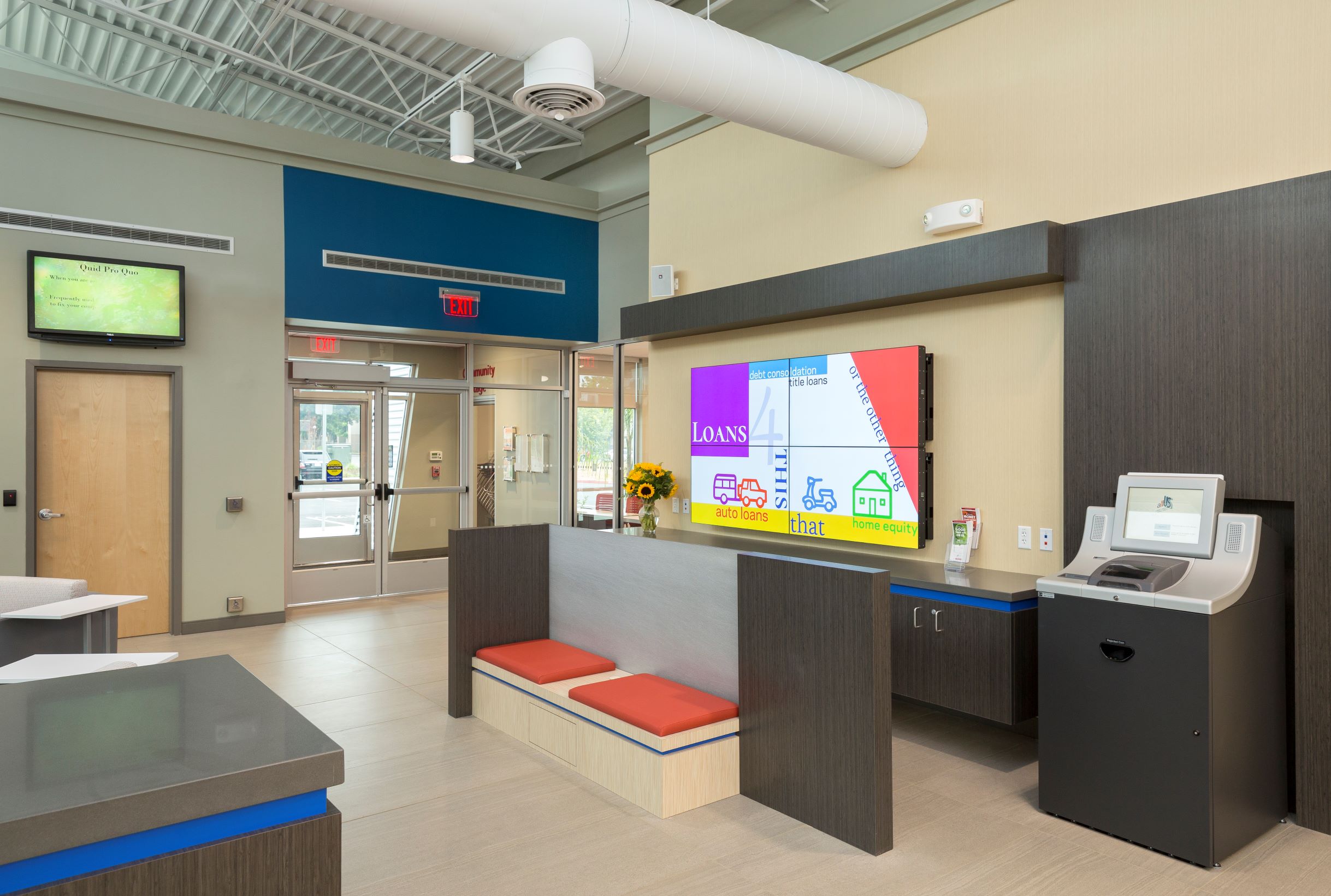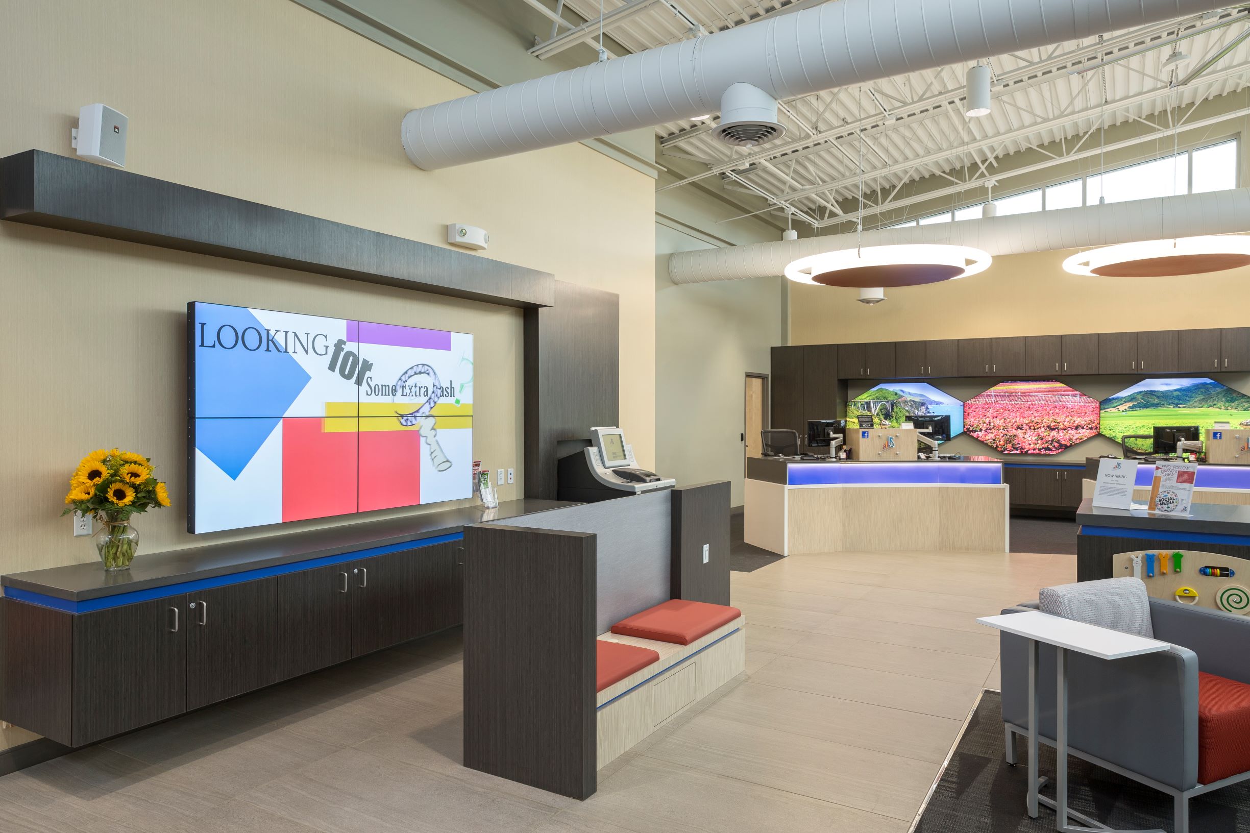 Providing their members a modern retail experience was the driving force behind the approximately 4,800 square-foot space. A concierge-style station greets their members upon entry along with the implementation of teller pods for a high-end member service experience. Branded elements such as a large video display wall and a digital feature wall behind the teller pods adds to the design goal and the credit union's mission. Other features of the new space include a lounge area with a coffee bar, a children's area with iPad access, a community room with video conferencing capabilities, and a shared parking lot with the new library.