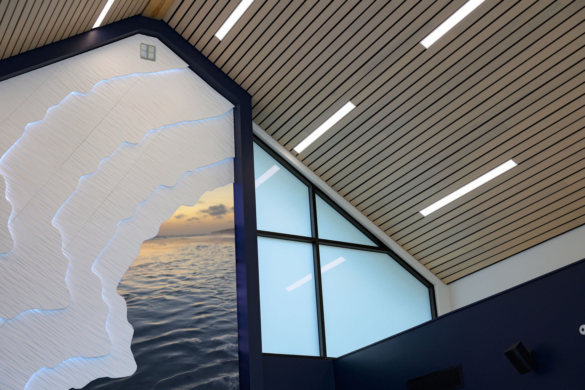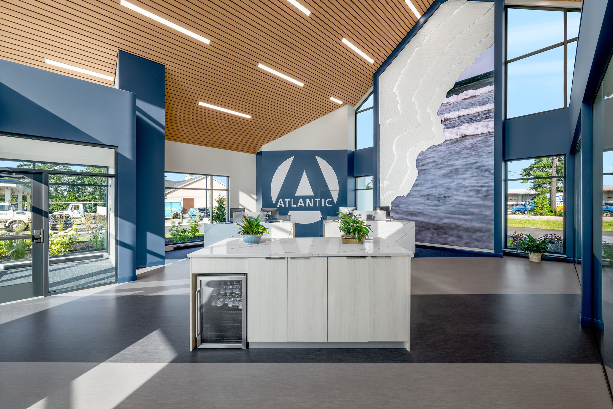 The LED wall featuring Maine's coast was implemented in this branch as well, and other technology was incorporated to elevate the branded space and enhance the member experience. These advances benefits both members and employees, while continuing to display the credit union's commitment to leveraging technology to meet the members needs. ITM drive ups provide improved operational efficiency while creating a more seamless, innovative look as they don't rely on a traditional teller line or deal drawer. Though a drive-up is common among many branches, this one is unique because the ITMs allows for lower full-time employee counts and extends hours of operation for members.
