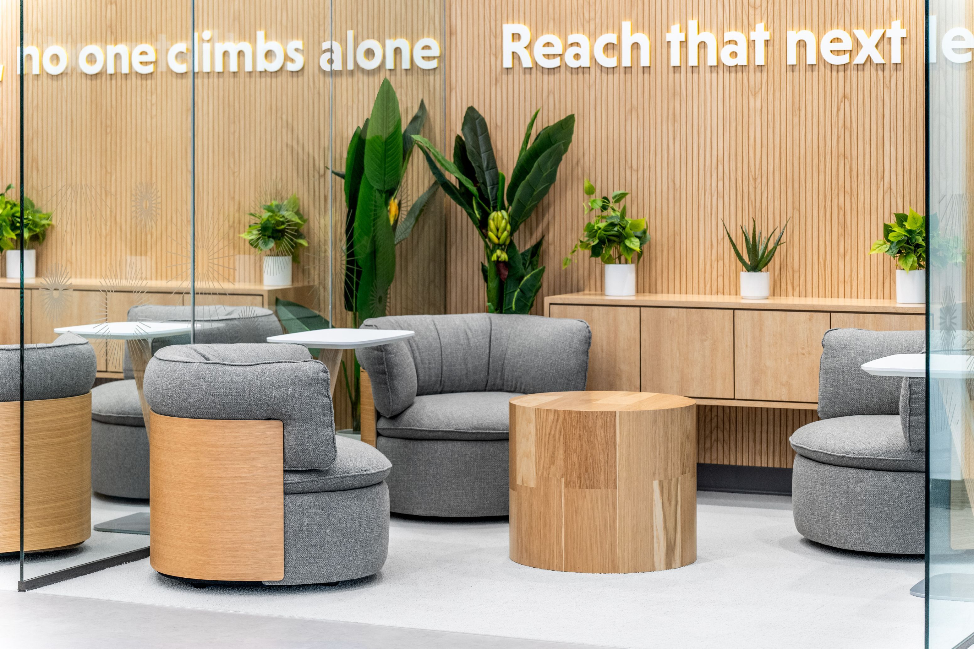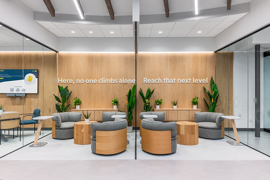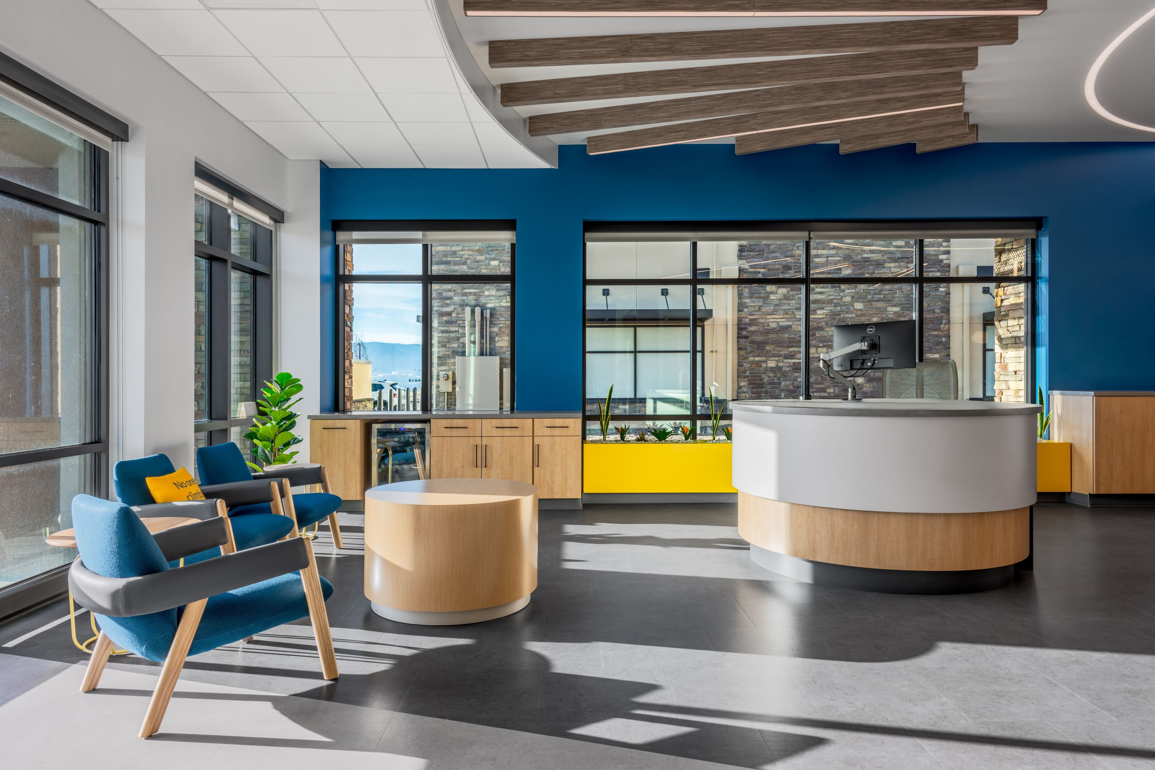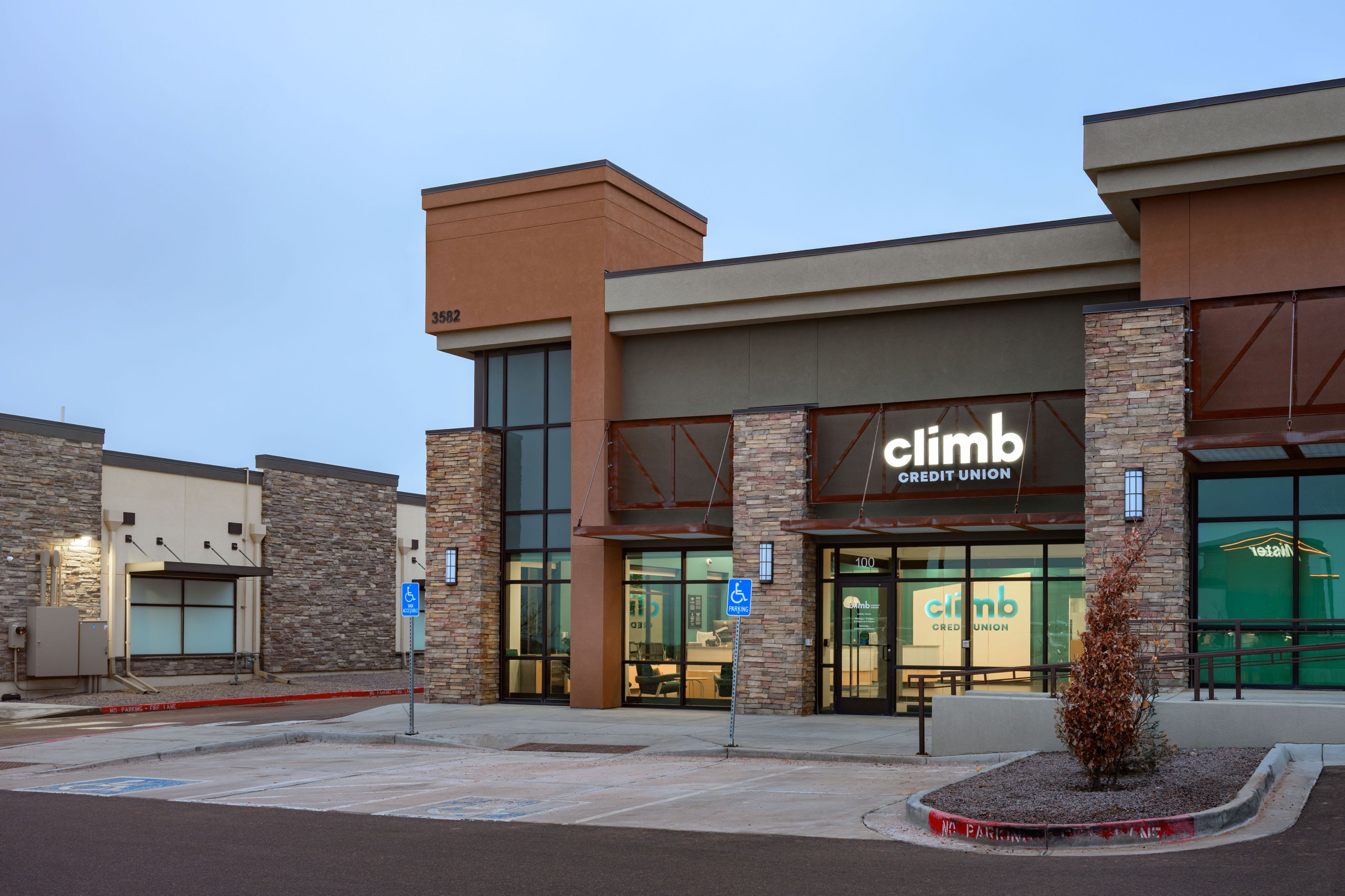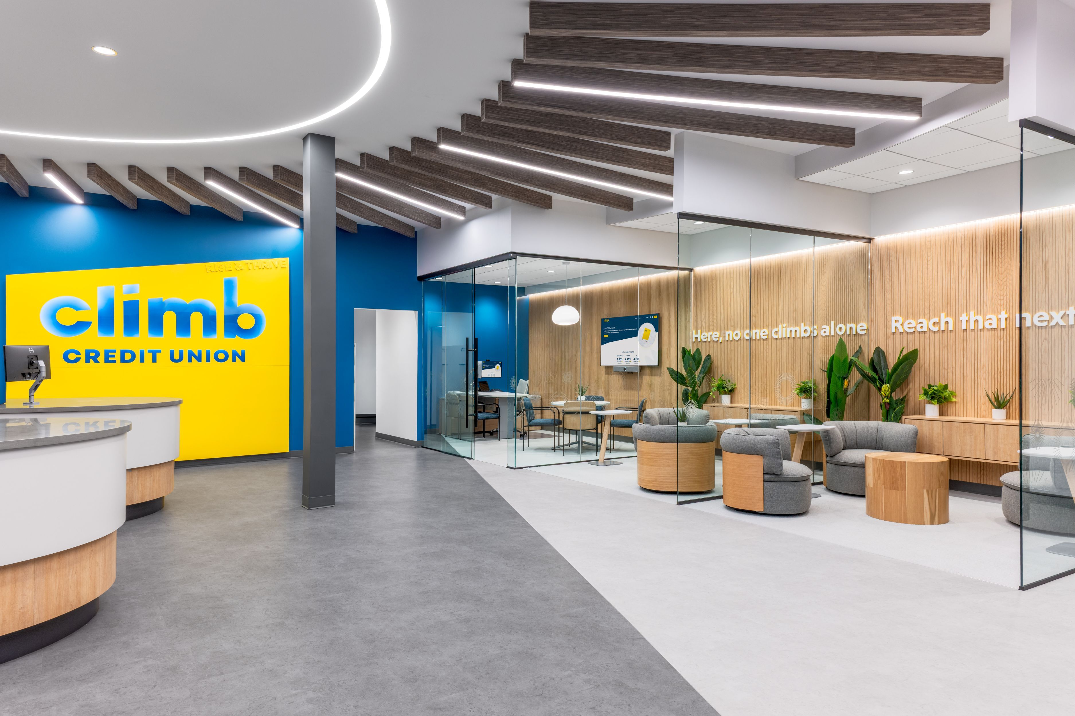 Climb Credit Union started out in 1951, with $157 from the seven founding members. Today, serving over 40,000 members with six branch locations, Climb Credit Union is determined to help each of their members reach financial freedom. Located in a busy shopping center, this Colorado Springs branch was designed to reach current and potential members more efficiently. After rebranding from their previous Sooper Credit Union identity, Climb Credit Union knew they needed a space that would create a welcoming atmosphere, ensuring the whole community knew that Climb Credit Union was there to help them 'make the climb'.