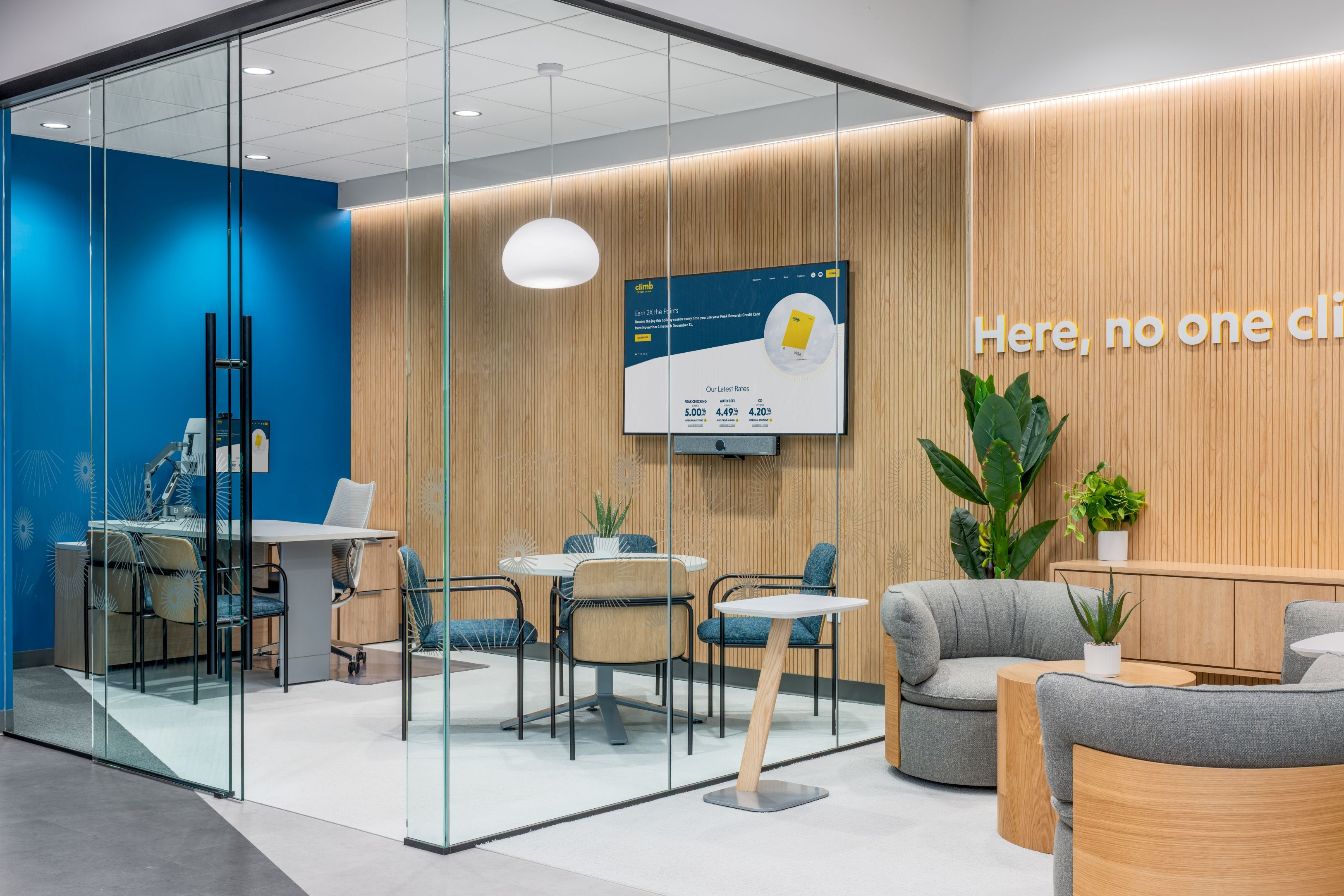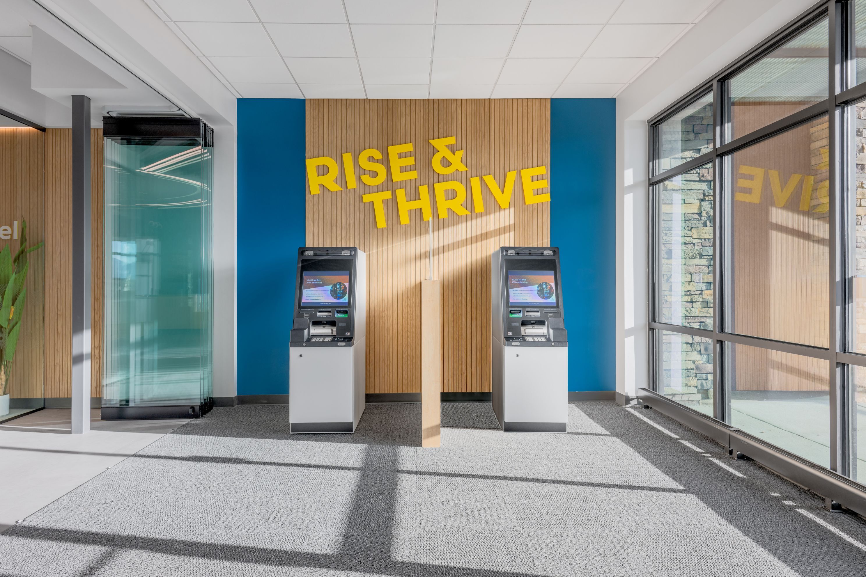 Throughout the space, you'll notice round, organic feeling sunburst patterns. From the ceiling to wall and glass decals, Climb Credit Union's community centric, round-table approach is solidified time and time again. The casework, paint, and furniture continue to remind visitors of the brand that is there to help them make their financial climbs. With this branch technically considered a microbranch, the glass partitions between spaces contribute to the open feeling of the floorplan. Breaking the bounds of a typical entry vestibule by using moveable glass doors, the lobby space opens to the vestibule during regular branch hours, and closes during off-hours self-service. By using glass doors, the space feels approachable and inviting, even during self-service hours.