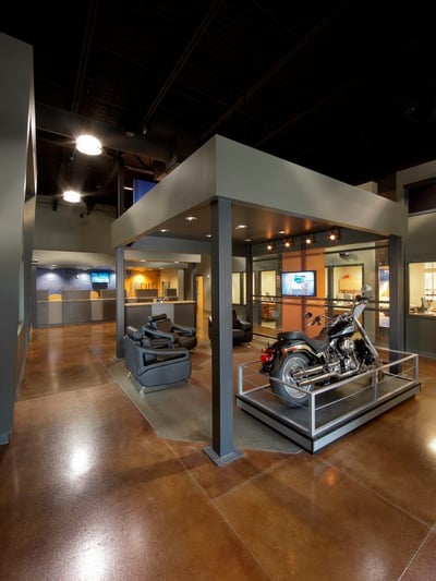The design team at La Macchia Group worked together to create a new space that reflected the character of Harley Davidson Motor Company. They also deliberately included space for strategically placed Harley motorcycles inside the building in order to add to the uniqueness of the lobby. Materials like stainless steel, concrete and glass were used to infuse an industrial feel while also making the space comfortable for members while they conduct their business.