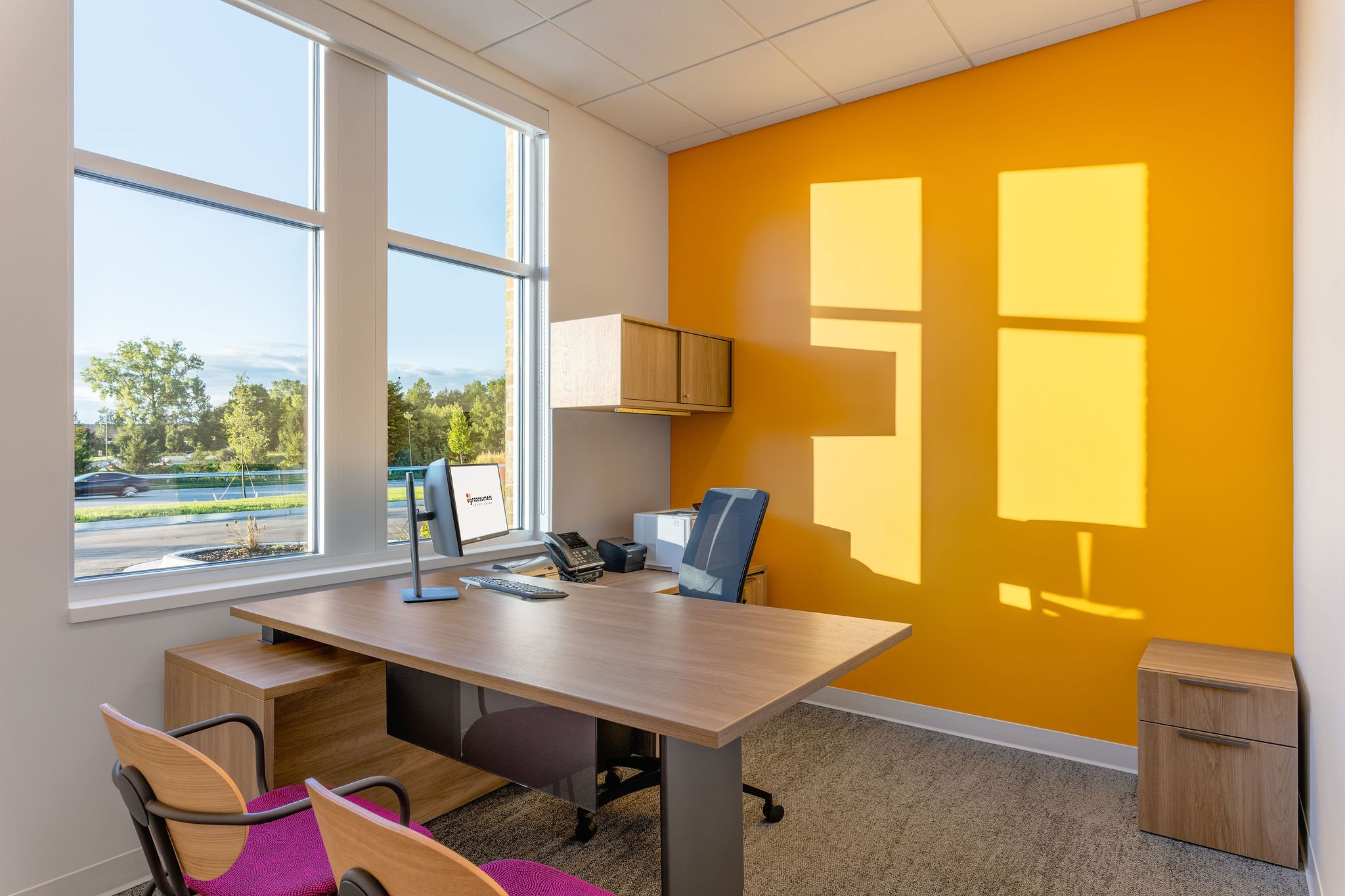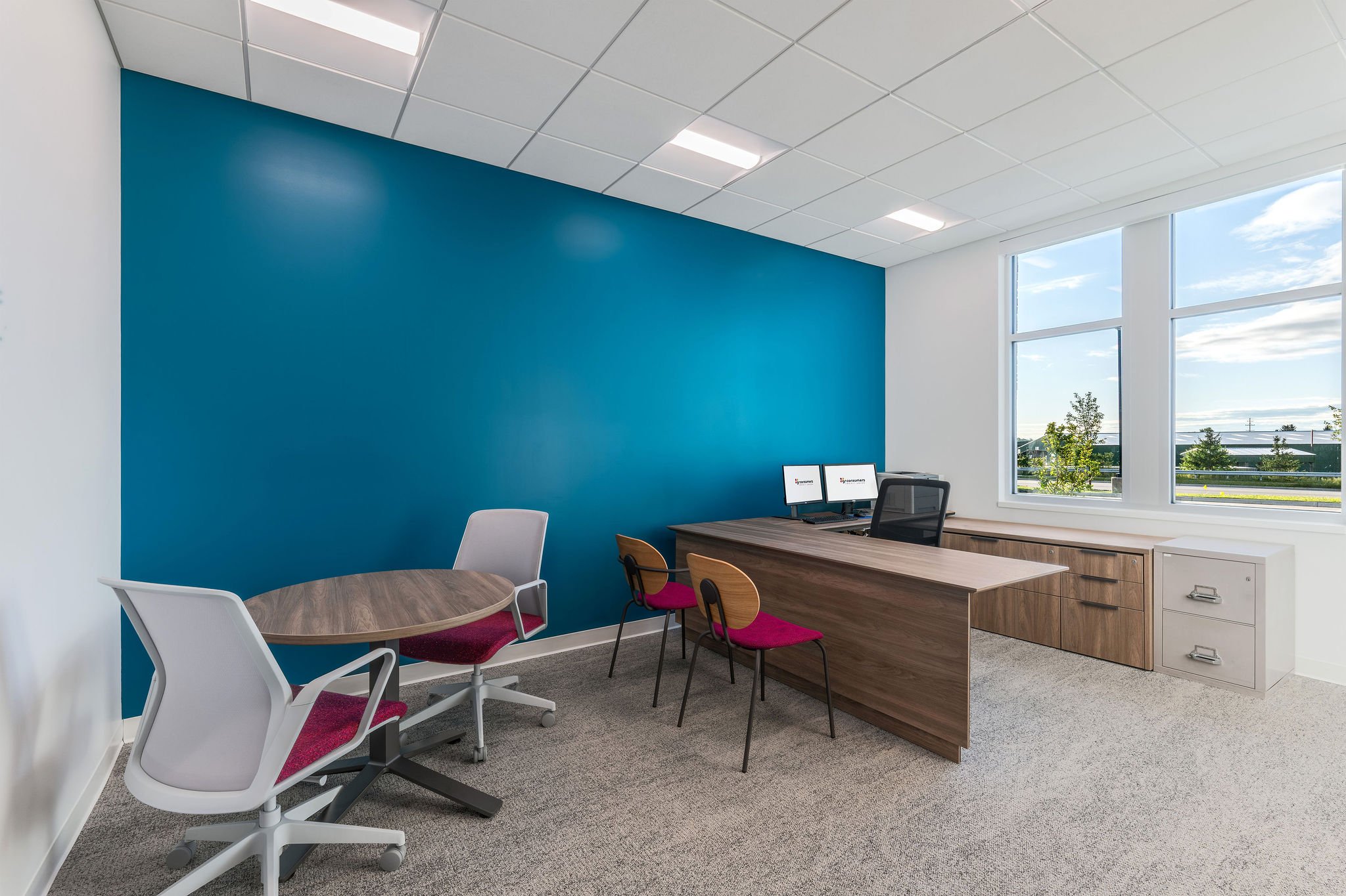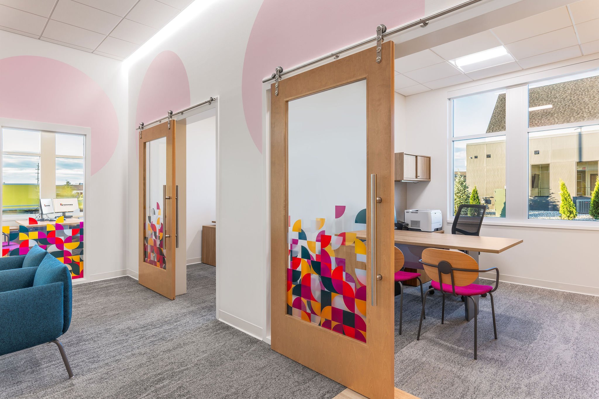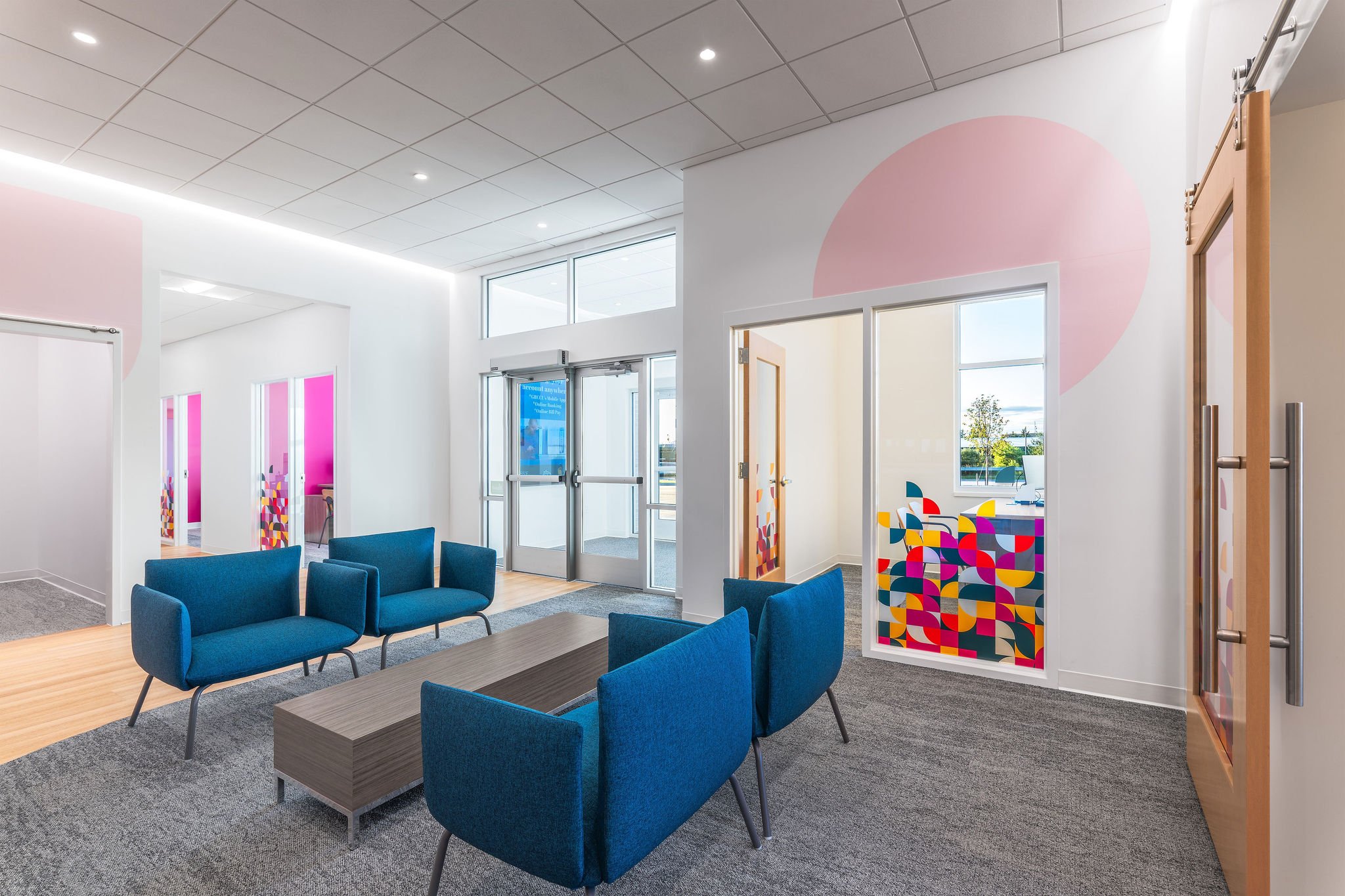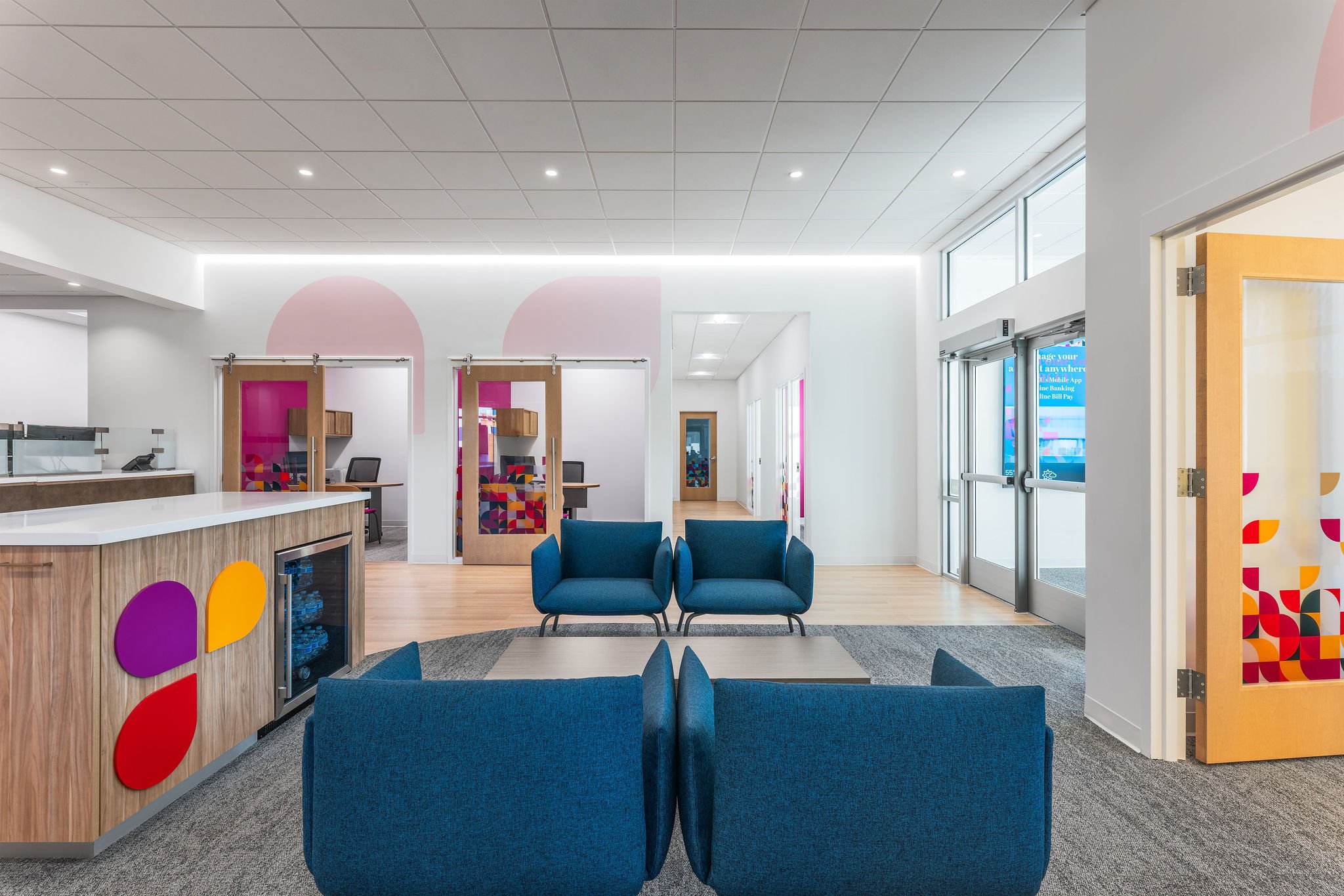 Their new Wyoming, Michigan branch reflects their recent efforts in creating a vibrant and welcoming space for members and staff. The open floorplan and glass office doors provide a combination of functionality and approachability. The brand colors and elements strategically placed throughout the branch combined with the ample natural light create a modern atmosphere that captures the spirit of their brand and mission. From the inviting lobby to the carefully designed service areas, every detail supports a seamless and engaging member experience that fosters connection, transparency, and community.
